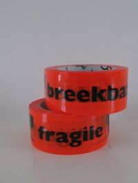 Tape Oranje 48mmx66 mtr. met tekst BREEKBAAR& FRAGILE.