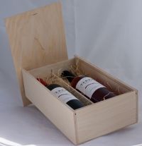 Houten wijnkist met schuifdeksel voor 2 flessen.
